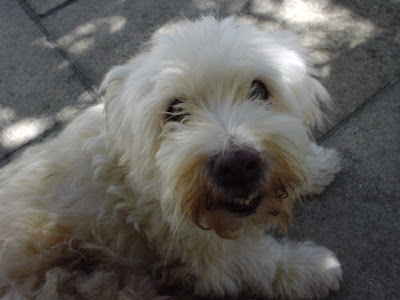 We arrived at this really grotty house in Thornton - the people looked even grottier!!! We walked through the dark, dingy house to their back yard which was smelly and full of dog poo - and dogs. Flea bitten, very sorry looking puppies - but cute non-the-less. We wanted to rescue all of them but had to just choose one. I was wearing a pair of denim dungarees with a big pocket at the front - big as far as pockets go anyway. This little dirty-white ball of fluff fitted right in that pocket and that's how he got to his new home. We bathed him and got rid of most of the fleas. The details are all a little hazey - it was a long time ago. I just remember that he was just too cute for words! He was a bit younger than the required 6 weeks cos his eye's were barely open yet.